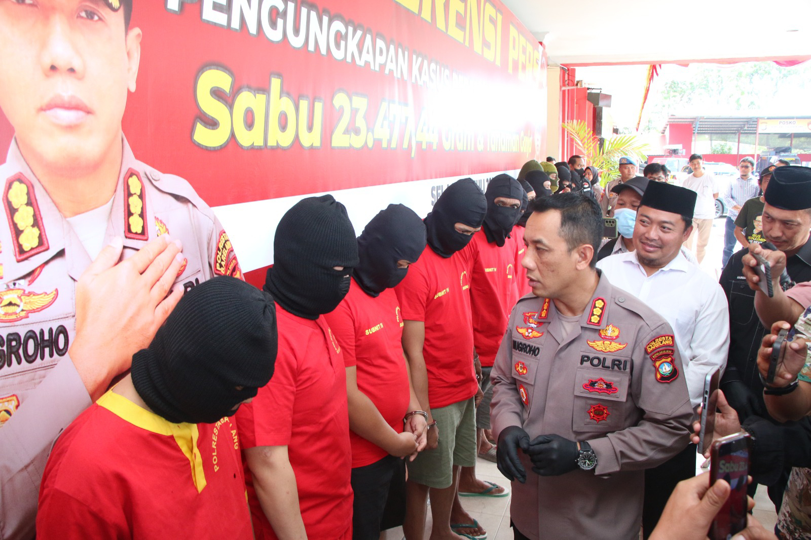 Hari ini akan kita release pengungkapan tindak pidana narkotika oleh Satresnarkoba Polresta Barelang, saya mengapresiasi Kasat Resnarkoba beserta personel Satresnarkoba Polresta Barelang dalam mengungkap tindak pidana narkotika sebanyak 9 kasus selama 1 bulan , dari tanggal 31 mei sampai dengan 26 juni 2023. Dengan tersangka sebanyak 14 orang, 1 di antaranya perempuan dan barang bukti Narkotika yang berhasil di sita Jenis sabu seberat 23.477,44 dan Tanaman Ganja di Pot Hidroponik. Ucap Kapolresta Barelang Kombes Pol Nugroho Tri N, SH, SIK, MH.
